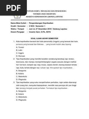 M Hasyim M S Ag M Ed Soal Uts Psikologi from imgv2-2-f.scribdassets.com Contoh soal mata kuliah pengembangan kepribadian. We did not find results for: Check spelling or type a new query. Maybe you would like to learn more about one of these?
